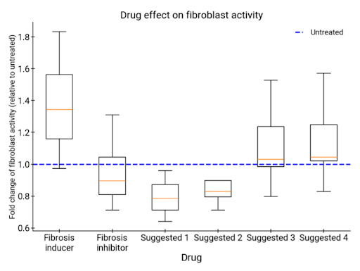 Comparison of treatments derived from AI co-scientist-suggested liver fibrosis targets versus a negative control (fibrosis inducer) and a positive control (fibrosis inhibitor).