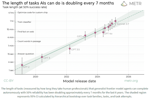 The pace of AI advancement is accelerating at an unprecedented rate. A recent report from METR, a research nonprofit focused on evaluating the capabilities and risks of frontier AI systems, reveals that the length of tasks these models can reliably complete (at a 50% success rate) has been doubling every seven months for the past six years, with some analyses showing a doubling as fast as every three months. Extrapolate that trend, and within a few years, AI could autonomously tackle week-long software projects—tasks that currently demand days of human effort.