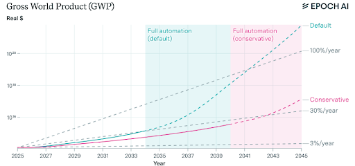 This exponential growth isn’t confined to coding or math. Epoch AI, a multidisciplinary research institute investigating AI’s societal and economic impacts, developed the Growth and AI Transition Endogenous (GATE) model to forecast how compute investment drives automation, which in turn fuels production in a self-reinforcing loop. Their conservative estimate predicts a staggering >30% year-over-year growth in gross world product by 2045, with global compute investment potentially reaching 10% of GDP—a 50-fold increase over today. The economic implications of such rapid automation would be profound, potentially reshaping industries and labor markets at an unprecedented pace.